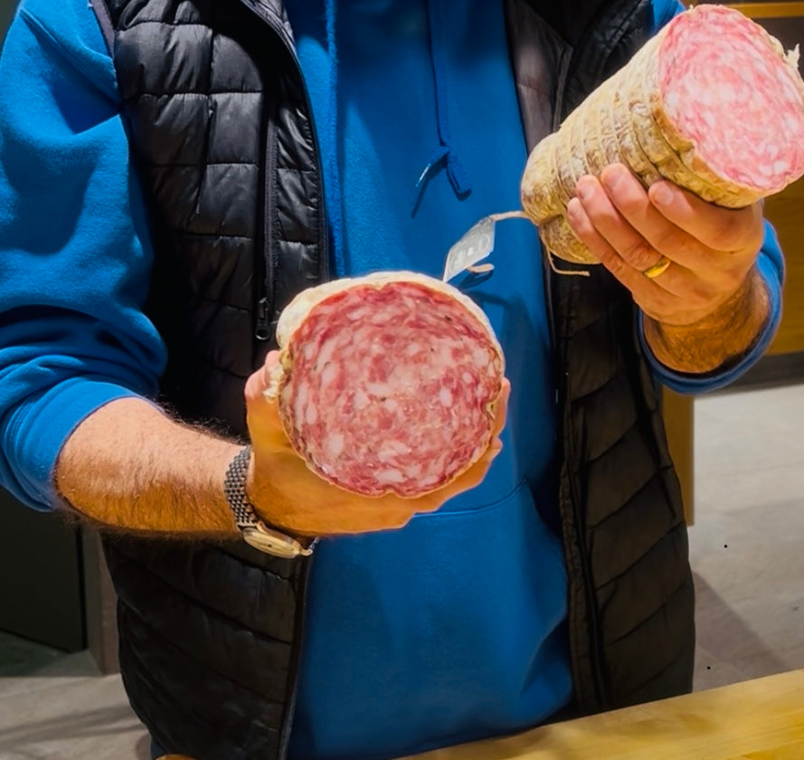 Für diese Salami von Stefano Calligaris werden die besten Stücke seiner eigenen Schweine verwendet. Wobei alle Teile des Schweins: Keule, Lende, Bauch, Schulter verwendet werden.Diese Sopressa wird mindestens sechs bis acht Monate gereift um die intensiven Aromen zu entwickeln, die für diese traditionelle Wurstspezialität charakteristisch sind.